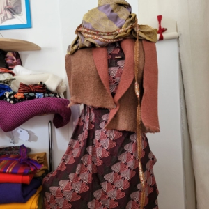 Wir haben angefangen Schicht um Schicht Stoffe auszuprobieren.Wortlos zu fühlen und zu sehen was gut tut am Körper, was kleidet, was in Ressonanz geht mit dem was ist, was gesehen werden will.